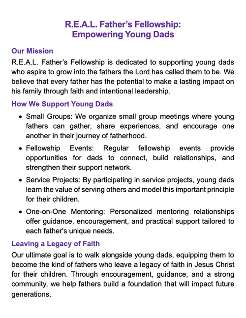 We understand the heavy burdens and pressures of being a husband, father, and provider, pressures that often go unrecognized by others. Through small groups, game day watch parties, and outreach projects, we create a community of trust and support, giving men the guidance they seek to navigate life's challenges.